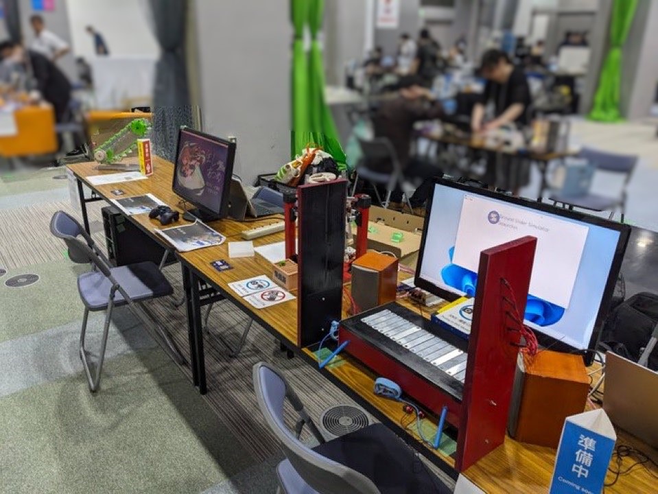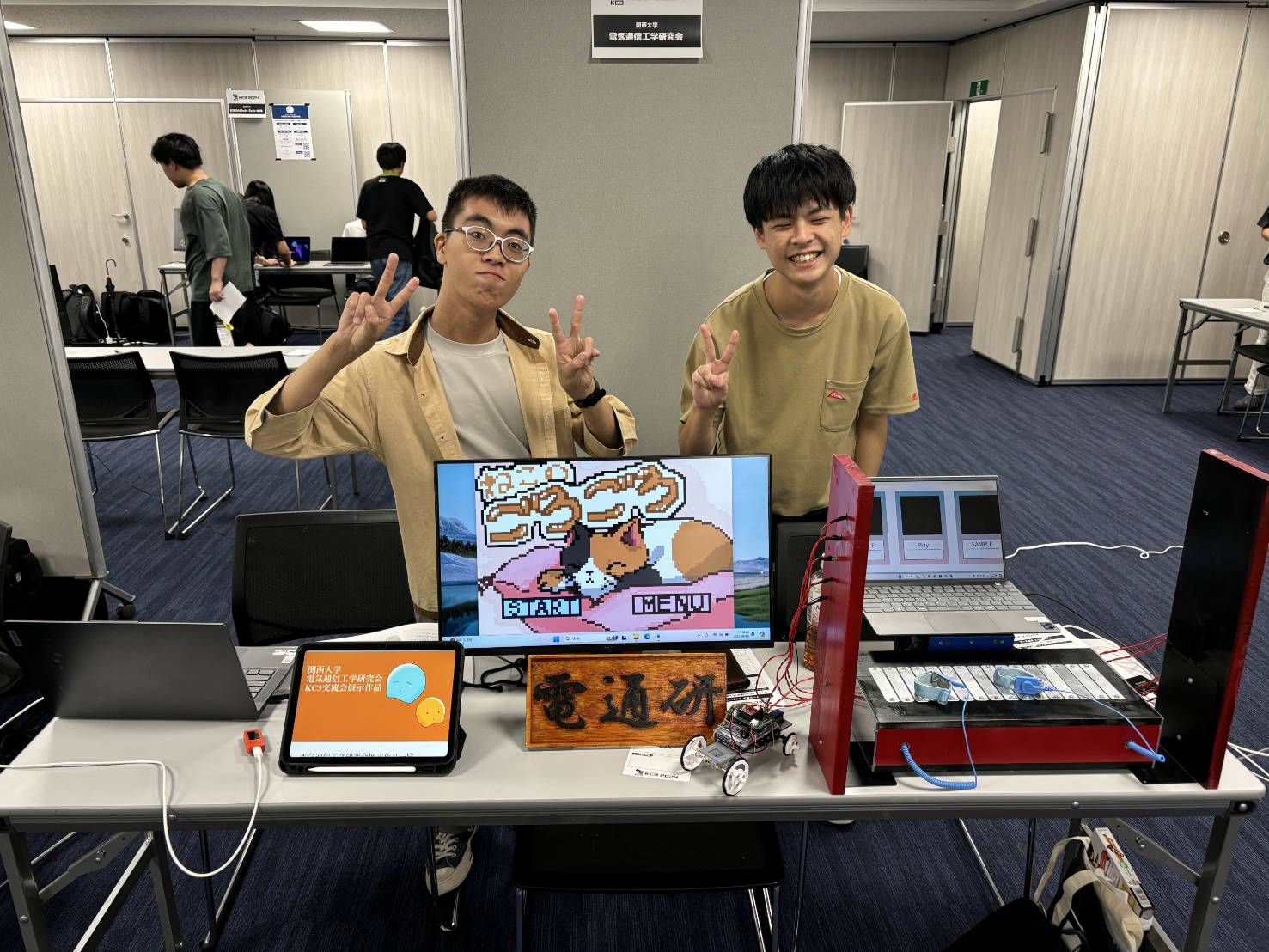 電通研メンバーそれぞれが、3Dアクションゲームや高速回転除夜の鐘など各々のユニークな作品を展示しました。